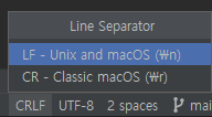 해결하려면 에디터에서 Line separator 설정을 LF로 바꿔주면 된다. VS Code, Intellij 동일하게 우측 하단에 있다.