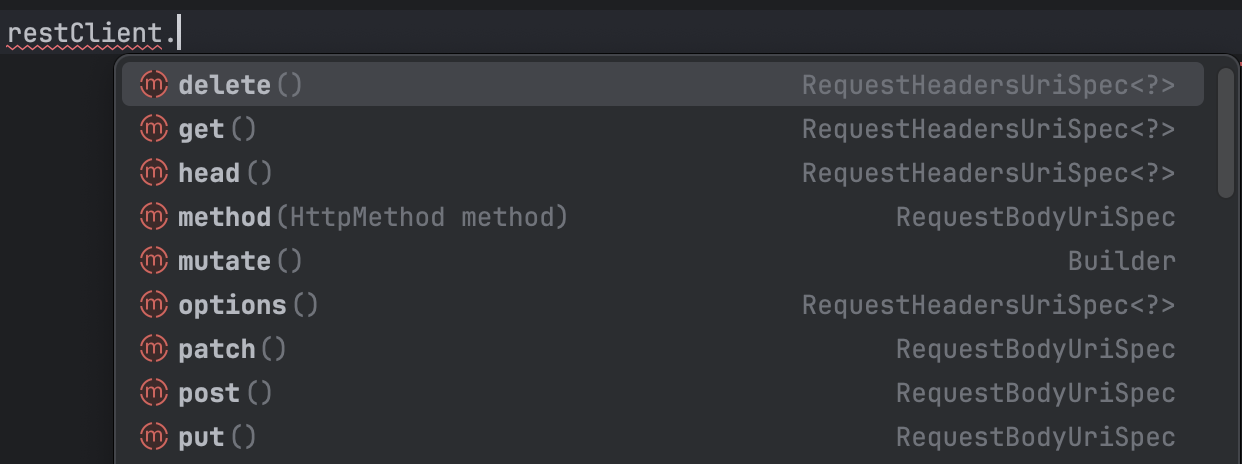 RestClient defaultClient = RestClient.create(); // RestClient.builder().build()와 같다.